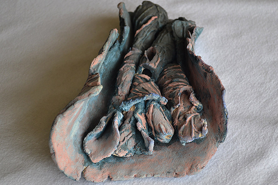 Looking back on this piece it feels like the curling form of the clay resembles the shape of bark when it's removed from a tree. Seen in this way it seems empty and dead, as though it's representing the skin without the life that should dwell within. Even though there are small growths on the inside, really they are just more empty shells lacking in flesh or substance.